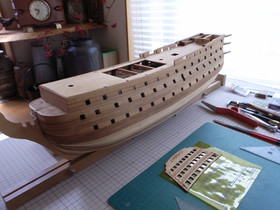 | 1/98スケールモデル“H.M.S. VICTORY“104門 戦列艦制作が最終仕上げ段階に入った。 20数年前にコーレル社(イタリア)製キットを 購入、組み立てを開始したが、船体部分がほぼ 出来あがった状態で千葉から仙台に引っ越しのため 陸送、引っ越しに際し業者が厳重梱包状態で運送した ものの漂流してしまった。 (今もまだ漂流中……行方不明) 幸いにも手元に残っていた図面、説明書に従い6mm厚航空ベニヤ板を購入し、糸のこを使用し、 キールを伐り出す等すべての部品を手作り、業務 多忙もあり製作の途中でお蔵入りになっていた。 |