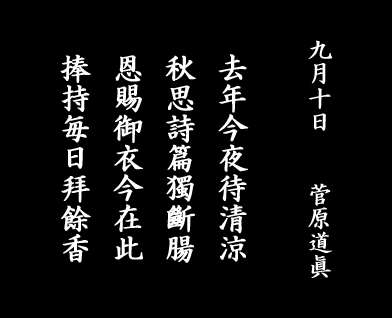 九月十日 菅原道真 去年の今夜 清涼に 待す 秋思の詩篇 獨り 斷腸 恩賜の御衣 今 此こに在り 捧持して 毎日 餘香を拝す |