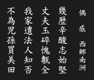 偶 感 西郷南洲 幾たびか辛酸を経て 志始めて堅し 丈夫は玉砕するも 甎全を愧ず 我家の遺法 人知るや否や 児孫の為に 美田を買わず |