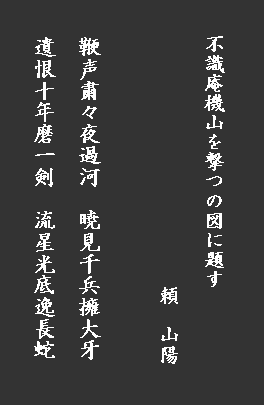 不識庵機山を撃つの図に題す 賴 山陽 鞭聲肅肅夜河を過る 暁に見る千兵の大牙を擁するを 遺恨なり十年一劍を磨き 流星光底長蛇を逸す |