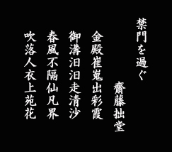 禁門を過ぐ 齋藤 拙堂 金殿崔嵬彩霞より出で 御溝汨汨清沙に走る 春風隔てず仙凡の界 吹いて人衣に落とす上苑の花 |