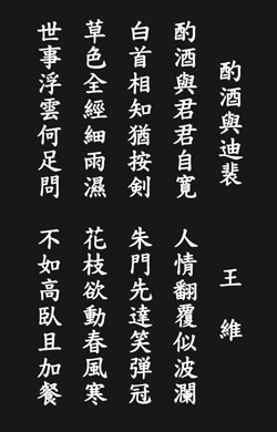 酒を酌んで裴迪に与う 王 維 酒を酌んで君に与う 君自ら寛うせよ 人情の翻覆 波瀾に似たり 白首の相知 猶剣を按じ 朱門の先達 弾冠を笑う 草色 全く細雨を経て湿い 花枝 動かんと欲して 春風寒し 世事浮雲 何ぞ問うに足らん 如かず 高臥して且つ餐を加えんには |