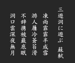 三游洞に遊ぶ 蘇 軾 凍雨霏霏として 半ば雪と成る 游人屨冷ややかにして蒼苔滑らかなり 辞せず被を携えて 巌底に眠ることを 洞口 雲深くして夜月無し |