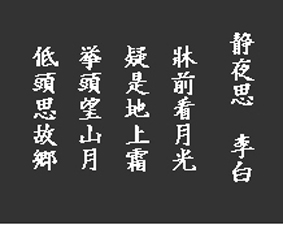 静夜思 李 白 牀前 月光を看る 疑うらくは是れ 地上の霜かと 頭を挙げて 山月を望み 頭を低れて 故郷を思う |