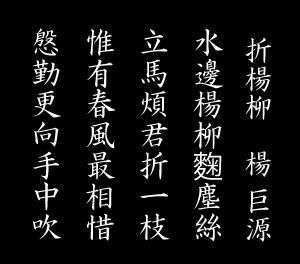 折塔柳 楊 巨源 水邊の楊柳 麴塵の絲 馬を立め 君を煩はわして一枝を折る 惟 春風の 最も相惜しむ有り 慇勤に 更に手中に向って吹く |
