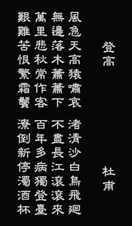 【詩 形】 七言律詩 〔押韻〕 哀・廻・来・薹・杯 【語 釈】 登 高=陰暦九月九日重陽の節句に高台に登って厄払いをする風習があった。 風 急=風が強い 天 高=空が高く晴れ渡っている。 猿嘯哀=猿の長くひっぱって鳴く声が哀しくひびく。 詩では猿はしばしば哀しいものとして捉えられている。 渚 =河の中洲。岸辺というとらえかたもある。 無辺落木=果てしなく広がる落葉樹の葉 簫 簫=風の音・ここでは落ち葉の散る音の形容 不 尽=尽きることのない。「無辺」に対応している。 滾 滾=水の流れる(さか巻く)形容。 万 里=はるか遠く故郷を離れる意。 他に「悲秋」の修飾語と捉え、見わたす限りの意に取る説もある。 悲 秋=もの悲しい秋。 作 客=旅人となっている。(注※) 百 年=一生涯。生まれてこのかた。 臺 =台・ここでは高台 艱 難=さまざまな苦難。 苦 恨=ひどくうらめしい。「苦」は副詞で、はなはだしい意。 繁霜鬢=霜が降りたように白くなった揉み上げの毛。 鬢 =耳ぎわの毛。 潦 倒=老いぼれるさま。 新 =近ごろ~したばかり。 濁酒=にごった酒・どぶろく。 (注※)漢字「作」について 作の文字は日本語では「製作、つくる」等で使いますが 中国語では「 ○○ する」の意味があります。 ここでは客をする・・・、客をするはおかしいので客になるとなります。 |