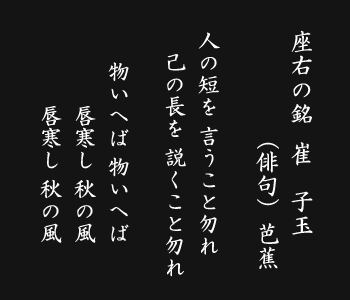 【詩の心】『芭蕉庵小文庫』には〈座右之銘 人の短をいふ事なかれ 己の長を説くことなかれ〉と前書。またある真蹟懐紙には《ものいはで ただ花をみる友も哉とは何某鶴亀が云けむ我草庵の座右に書付けけるをおもひ出して》と前書きする。「座右の銘」《人の短を》云々は、『文選』巻28、崔子玉によるものであり、 「人の短を道うこと無かれ、己の長を説くこと無かれ。人に施しては慎んで念ふこと勿れ、施しを受けては慎んで忘るること勿れ・・・・・・。」 他人の足りないところを謗り、己の長を誇ることは、誰しもが経験することである。そしてこの種の言葉は、そのままむなしくわが胸に返ってくることも人はよく知っている。もちろんこの句はそんな芭蕉の自戒の話として書きつけられたものである。 |